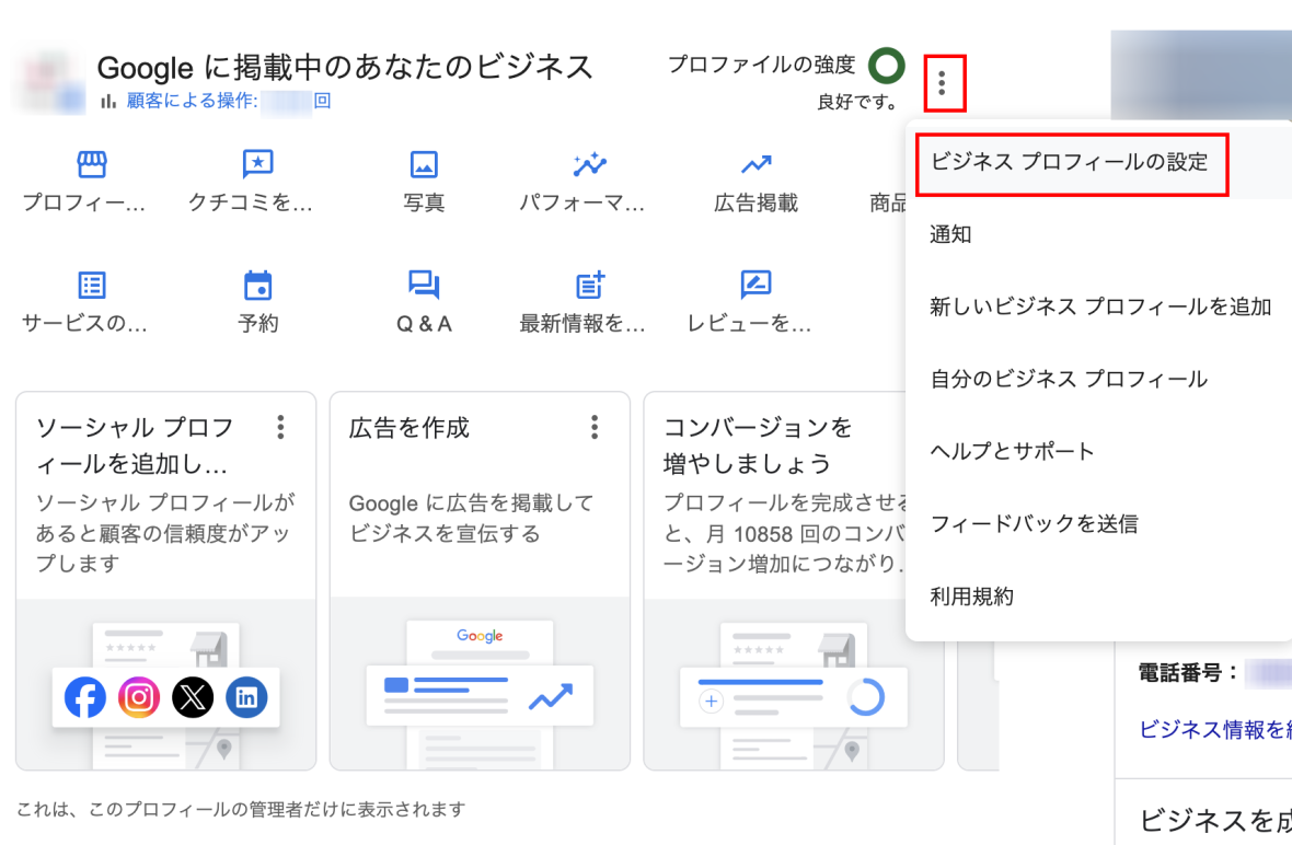 1.Google Chrome ブラウザで、オーナーまたは管理者になっているビジネスを検索して表示します。管理者だけに表示される情報欄の「︙」をクリックして「ビジネスプロフィールの設定」を選択します。