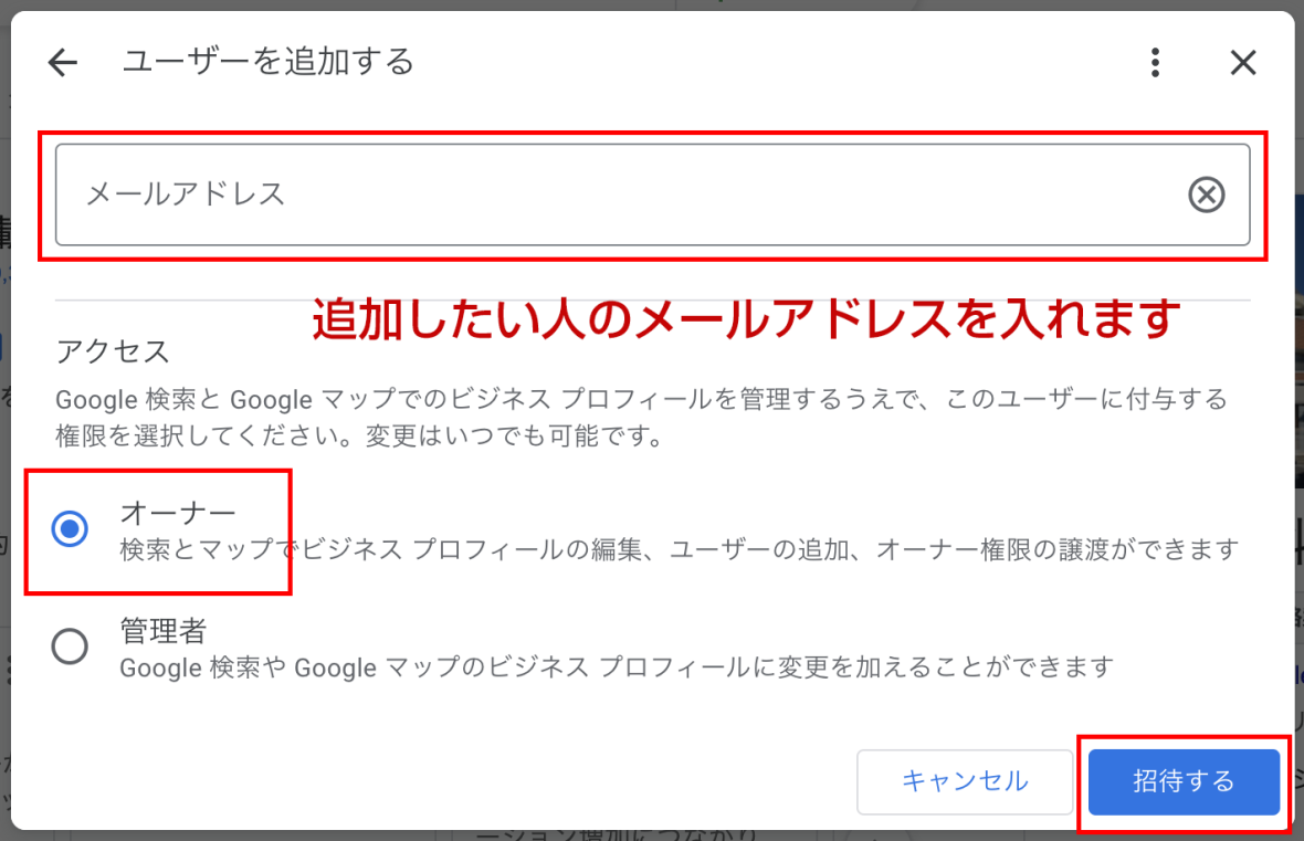 4.ユーザーを追加する画面で、メールアドレスに権限を付与したいユーザーのメールアドレスを入力します。権限は「オーナー」を選択します。後は、招待された側の操作となります。